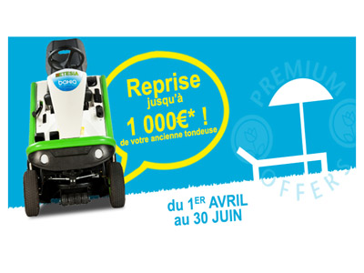 - Du 1er Avril au 30 Juin 2018, reprise jusqu’à 1000 Euros* de votre ancienne tondeuse.