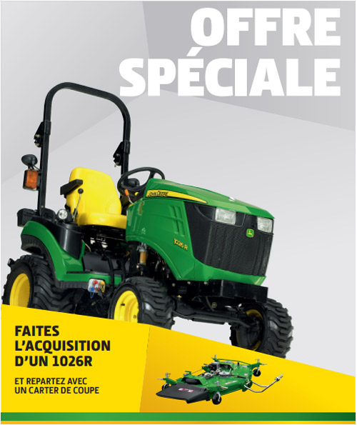 Nous vous offrons un carter de coupe pour tout achat d’un tracteur compact petite puissance John Deere 1026R.* Offre valable du 1er décembre 2015 au 31 octobre 2016.